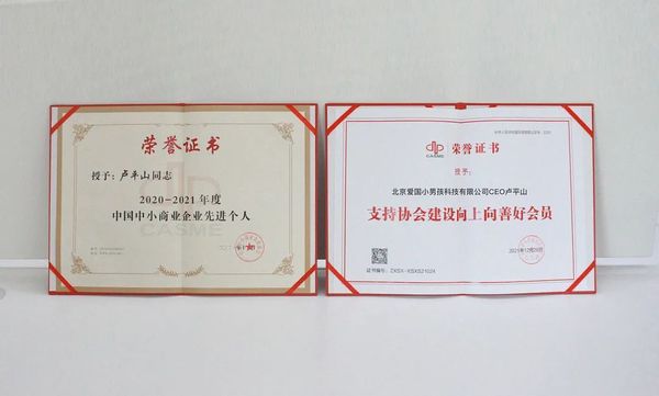 2021年12月26日,愛國小男孩CEO盧平山榮獲“2020-2021年度中國中小商業(yè)企業(yè)先進個人”稱號及“支持協(xié)會建設(shè)向上向善號會員”稱號。