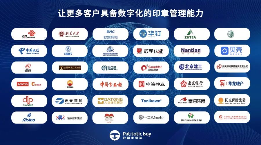 過去7年,愛國小男孩在客戶和伙伴的支持下,構建了成熟的物聯網產業服務網絡,營銷及技術支持服務體系覆蓋全國20多個省(區),攜手800余+戰略合作伙伴,為100000+企業客戶提供了可靠的印章智慧管理服務,持續領航數字化智能印章行業。