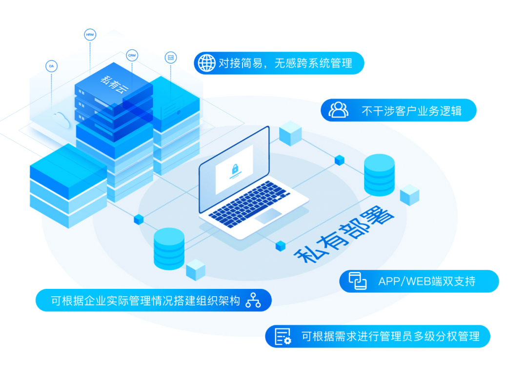 基于用戶底層需求定制開發,通過接口與組織的OA、HRM、CRM等系統集成,讓現有管理系統具有印章智慧管理能力。