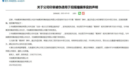 日前,葛洲壩集團官網發布《關于公司印章被偽造用于招搖撞騙事宜的聲明》稱,發現有不法分子打著“葛洲壩”旗號,通過偽造公司印章等方式對外簽訂合同,實施招搖撞騙。