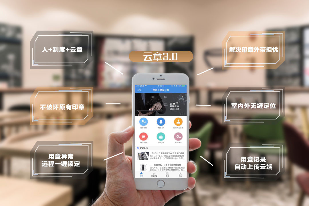 云章的便攜式、不改變公章實體、實時定位、蓋章瞬間同步魚眼雙攝鏡頭拍攝蓋章人、蓋章文件等特點,十分契合如今普遍存在的外出辦公、異地用章等實際,特別是為下屬部門、分支機構分布各地的單位、企業,提供了一套成本低、效率高的印章智慧管理解決方案。