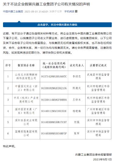 9月1日,中國(guó)兵器工業(yè)集團(tuán)微信公眾號(hào)發(fā)布《關(guān)于不法企業(yè)假冒兵器工業(yè)集團(tuán)子公司有關(guān)情況的聲明》。聲明稱,近期有不法分子通過偽造公章、相關(guān)材料等方式,將企業(yè)注冊(cè)為中國(guó)兵器工業(yè)集團(tuán)有限公司下屬子公司,以中國(guó)兵器工業(yè)集團(tuán)子公司名義開展業(yè)務(wù),假冒國(guó)企進(jìn)行虛假宣傳。