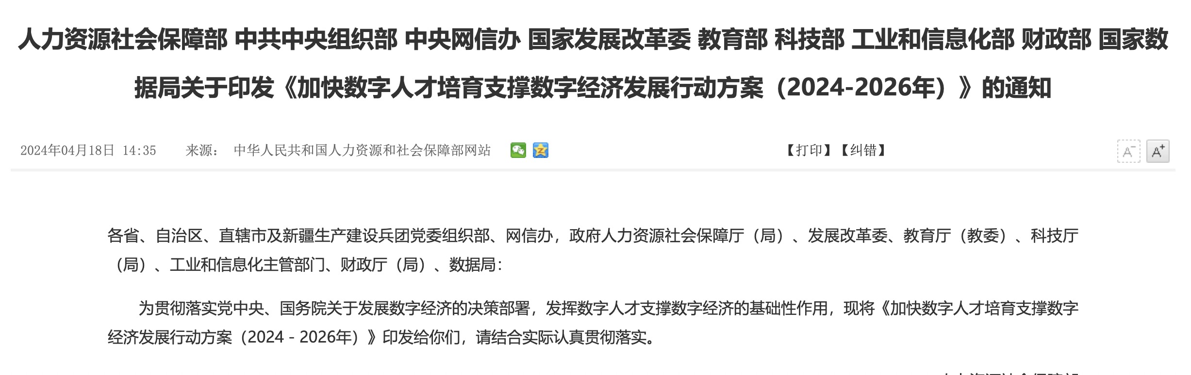 人力資源社會保障部等九部門日前聯合發布了《加快數字人才培育支撐數字經濟發展行動方案(2024—2026年)》,提出要緊貼數字產業化和產業數字化發展需要,通過數字技術工程師培育項目、數字技能提升行動、數字人才國際交流活動、數字人才創新創業行動、數字人才賦能產業發展行動、數字職業技術技能競賽活動6個重點項目,用3年左右時間增加數字人才有效供給,形成數字人才集聚效應。這是在深刻洞察數字經濟發展趨勢的基礎上,對我國數字人才培育目標和方向提出的可行路徑。