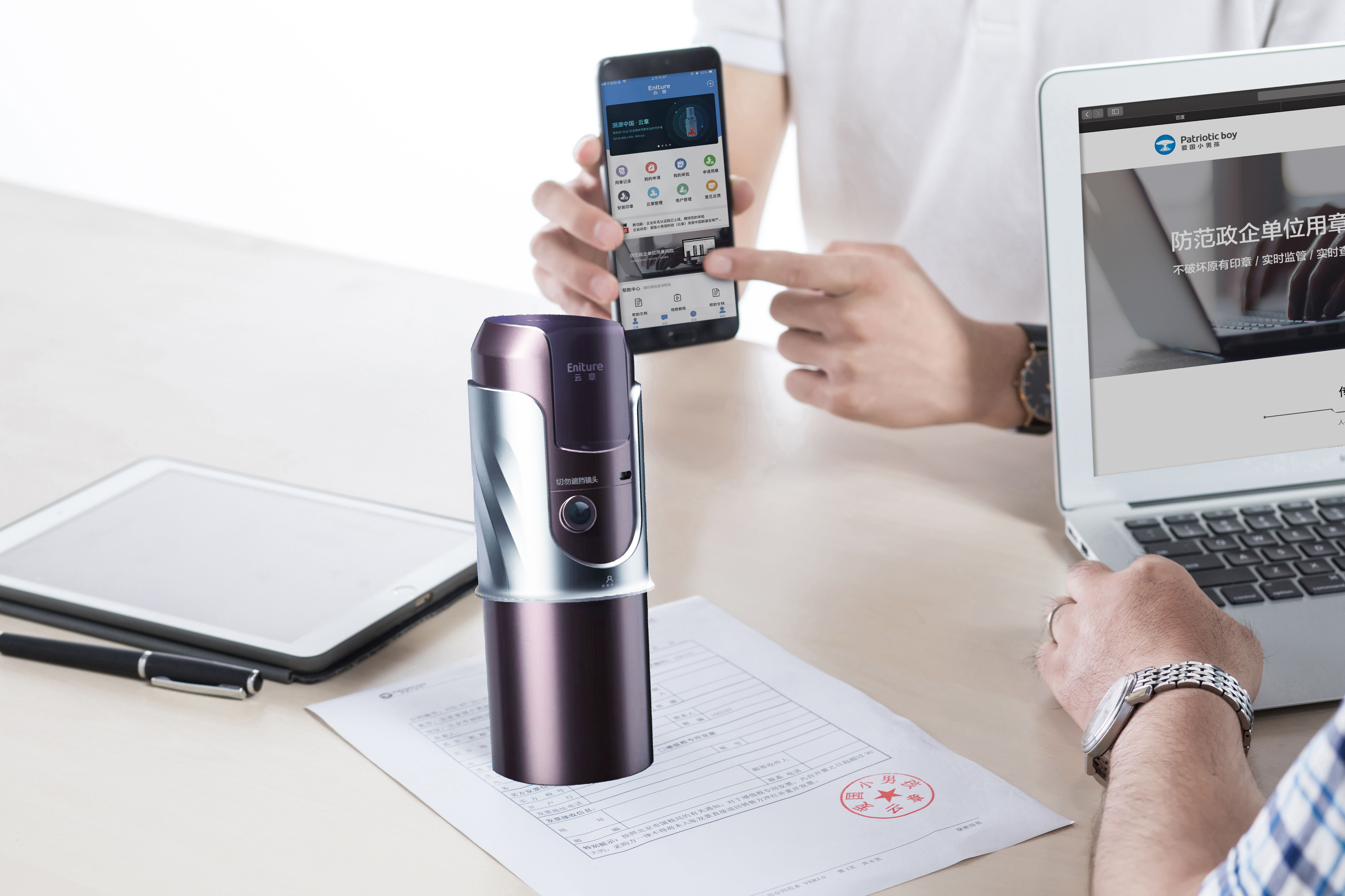 愛國小男孩“云章”設(shè)備不大,單手可握,重量輕,外出辦公攜帶起來也比較方便;具有印章鎖定、實時定位、分級權(quán)限、用印監(jiān)控、查詢統(tǒng)計等功能,可以根據(jù)實際公章管理制度,優(yōu)化公章審批流程,在云章APP上預(yù)先設(shè)置用章時間、次數(shù),蓋章時云章會自動采集并傳輸用章時間、地點、次數(shù)、對象等關(guān)鍵信息,記錄每一次蓋章的全過程,杜絕公章被濫用盜用、用章記錄不全等現(xiàn)象,提升公章管理安全系數(shù)。