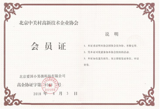 2018年8月3日,作為國家級高新技術(shù)企業(yè),在北京中關(guān)村高新企業(yè)協(xié)會隆重邀請下,北京愛國小男孩科技有限公司應(yīng)邀加入?yún)f(xié)會,成為其重要會員單位。