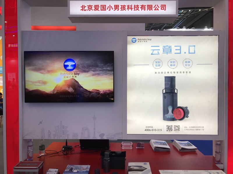 在展會現場,由愛國小男孩科技工作人員為到訪領導介紹了云章產品的實用及創新性。作為一家高新技術企業,云章由線下印章與線上APP相結合的智能印章一體化解決方案的展示,以及軟硬件創新能力,得到現場眾多領導的認可。